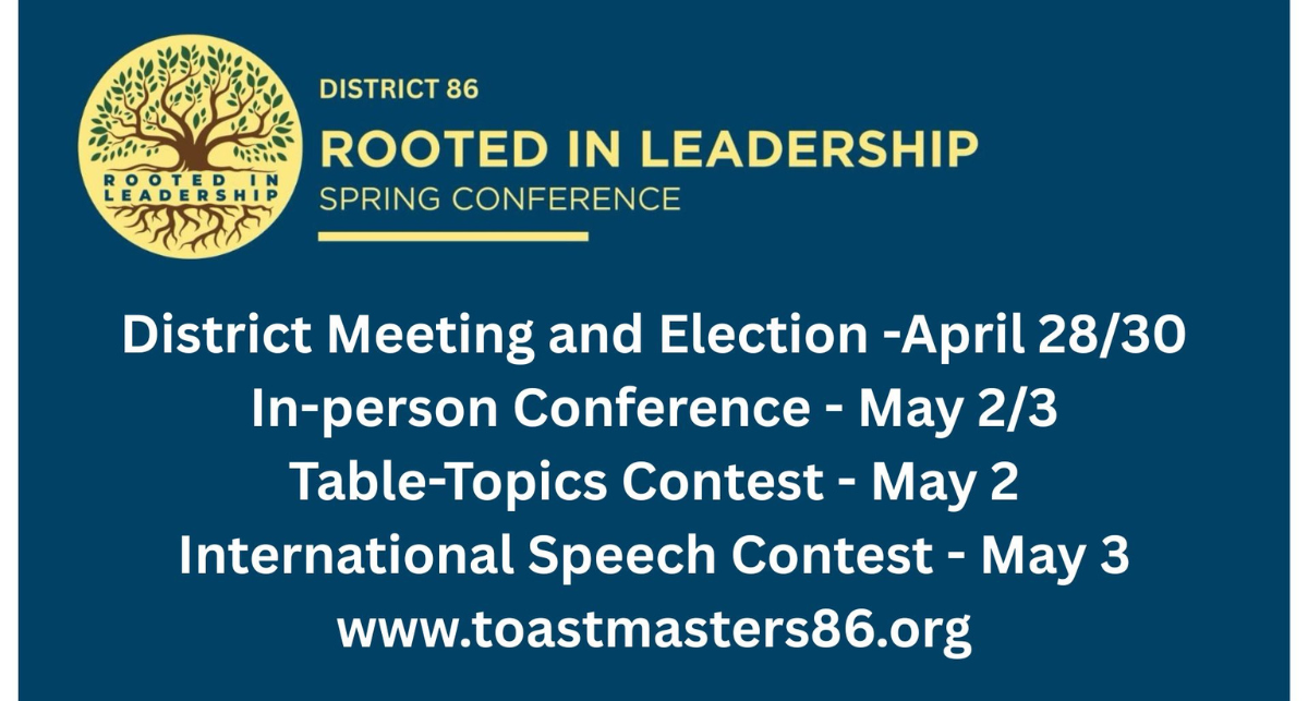 The May 2, 3 in-person part of the District 86 Spring Conference is in my