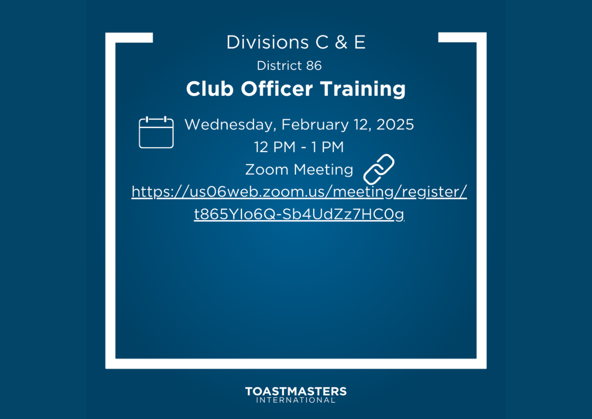 Ready to Elevate Your Leadership Skills? Join us for the Club Officer Training (COT) Round 2 hosted by Divisions C & E of District 86 Toastmasters International. Date: Wednesday, February 12, 2025Time: 12 PM - 1 PMLocation: Zoom (Online)Register Here: https://us06web.zoom.us/meeting/register/t865YIo6Q-Sb4UdZz7HC0g Why Attend? Strengthen Leadership Skills: Empower your club and lead effectively.Enhance Communication: Master techniques to inspire and engage members.Boost […]