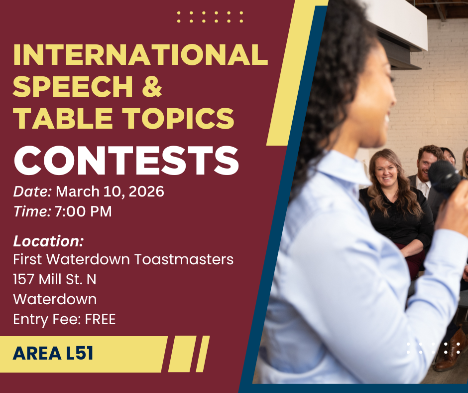 Address: Horizon Toastmasters, 251 North Service Rd W, Oakville Entrance Fee: Free
