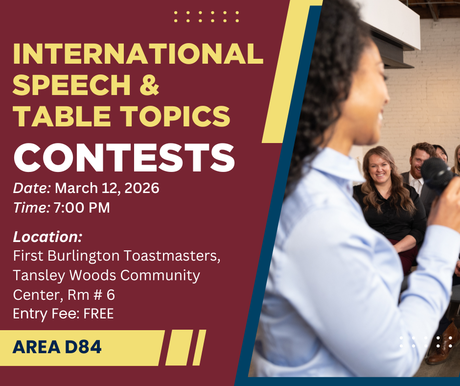 Address: First Burlington Toastmasters, Tansley Woods Community Center, Rm # 6 Entrance Fee: Free