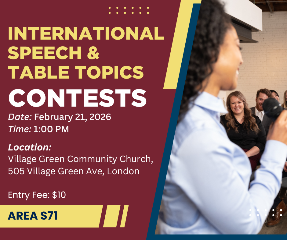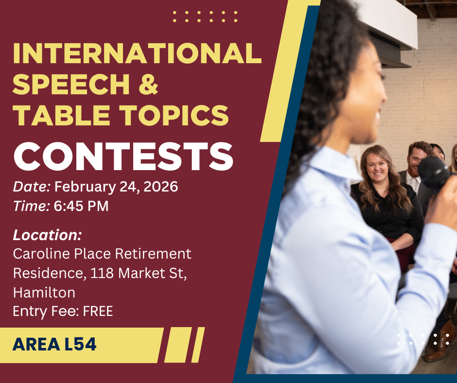 Club Contests Begin! International Speech and Table Topics contests are held at the club level during this window. Participate, plan and cheer on your members!