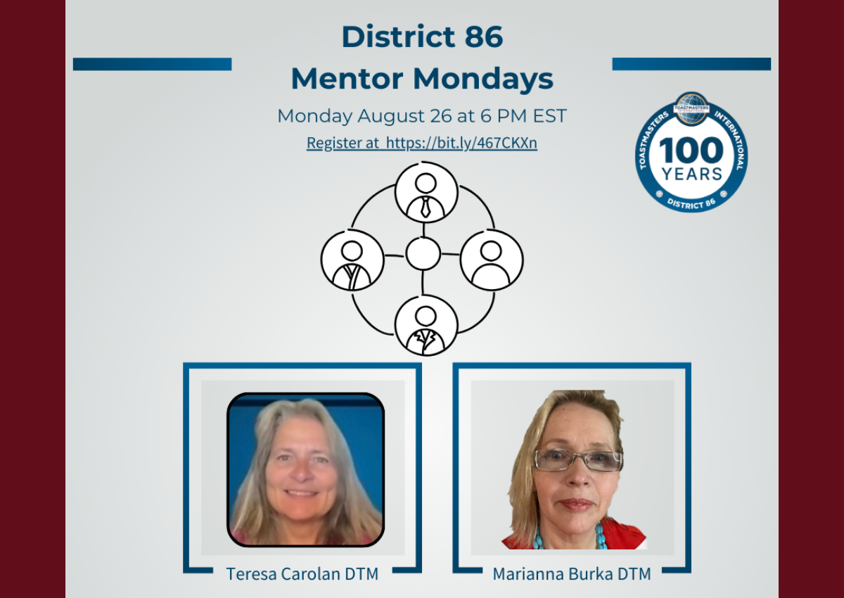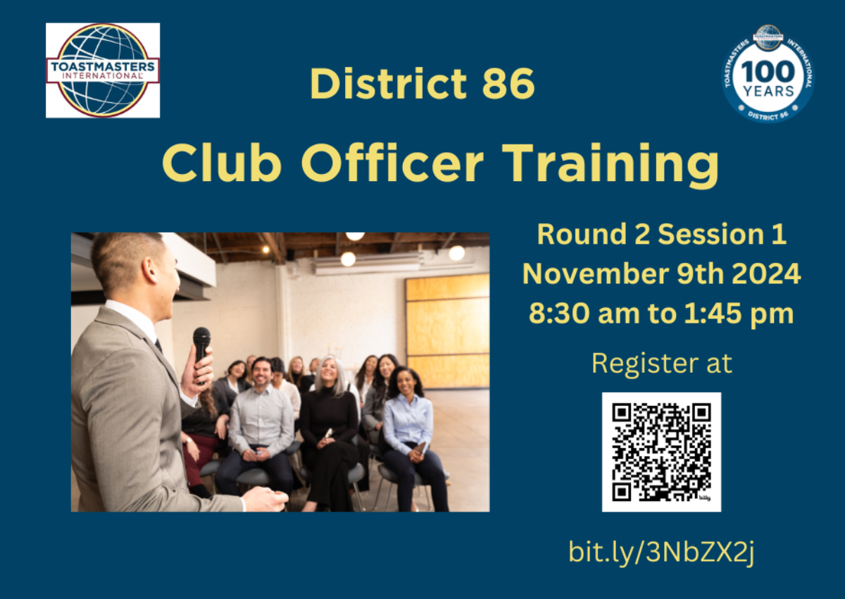 D86 TLI Club Officer Training - Round 2 Training Saturday November 9th 20248:30 am - 1:45 pm Register at: bit.ly/3NbZX2j Keynote Speaker: Luisa Montalvo, 1st Place Winner, Toastmasters International Speech Contest 2024Keynote Address: Farzana Chohan DTM, International Director, Toastmasters International Region 5Two sections of Club Officer Training: 9:10 am to 10:10 am and 12:40 pm to […]