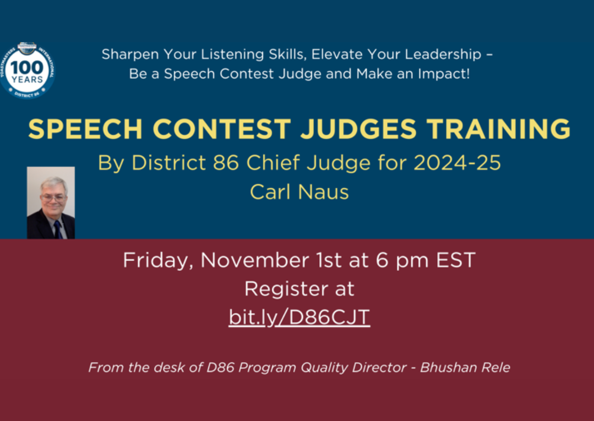 Speech Contest Judges Training District 86 PQD Bhushan Rele invites all members interested to be a Judges at a Club, Area and Division Speech Contests to attend the Speech Contest Judges training on Friday, November 1st at 6 pm EST Conducted by Carl Naus, DTM, District 86 Chief Judge for 2024-25 Register at:bit.ly/D86CJT
