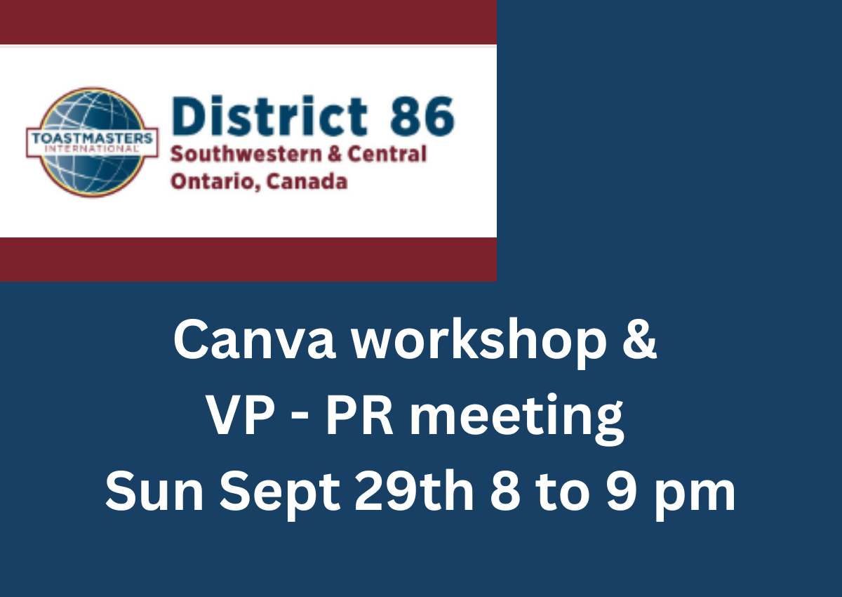 Canva Workshop (8 pm) and VP PR Meeting (8:30 pm) Sun Sept 29th 8 to 9 pm All members welcome to attend. online - zoom To register - https://www.eventbrite.ca/e/canva-workshop-and-vp-pr-meeting-tickets-1000160205097?aff=oddtdtcreator