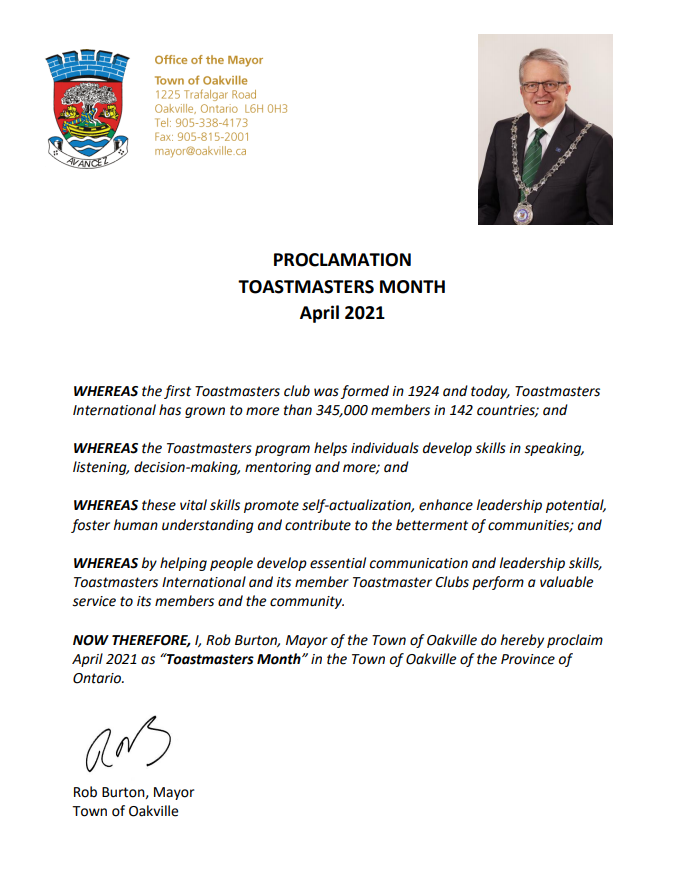 The Town of Oakville Mayor, Rob Burton is proclaiming April 2021 Toastmasters Month in Oakville.